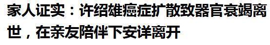 许绍雄家里人委托其生前好友黎芷珊,正式对外公布了这一消息,并透露许绍雄离世原因是因为癌症引发多器官功能衰竭。 2025年10月28日凌晨2点30分,许绍雄在家人的陪伴下安然离世。